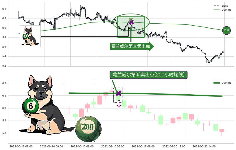 ⚀ 2022-06-15 14:00:00-小时显现 葛兰威尔均线 200小时均线 第⑥卖出点 走势反转见顶信号,后市看跌,卖出信号