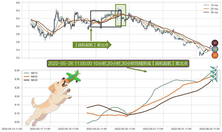 ⚀ 2022-05-20 09:00:00小时-2022-06-01 14:00:00小时显现 10小时-20小时-30小时均线 【战机起航】卖出点 看空信号,后市看跌,卖出