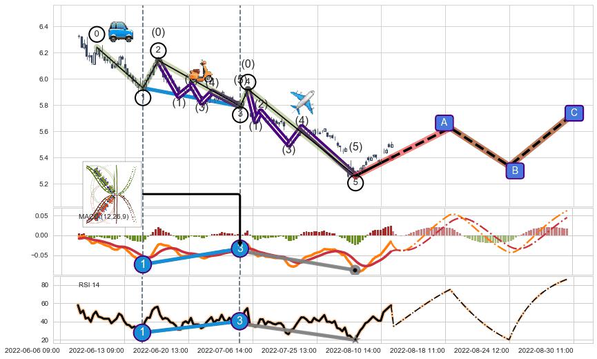 | 2 🅚:降势受阻 ➕ 🌊:波浪理论猜想下跌浪5已形成,猜想后续形成abc反弹上涨(均值回复) ☞ 看多信号 ⇥ 【🅚线】交织【图形】⇥ 综合量化分数: 58 | > |