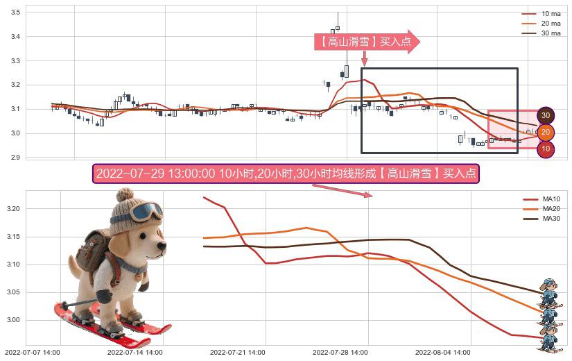 形态多维评估: ⚀ 2022-07-18 14:00:00小时-2022-08-10 13:00:00小时显现 10小时-20小时-30小时均线 【高山滑雪】买入点 看多信号,后市看涨,买入