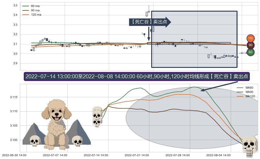 形态多维评估: ⚀ 2022-07-14 14:00:00-小时至2022-08-08 14:00:00-小时显现 60小时-90小时-120小时均线 【死亡谷】卖出点 看空信号,后市看跌,卖出