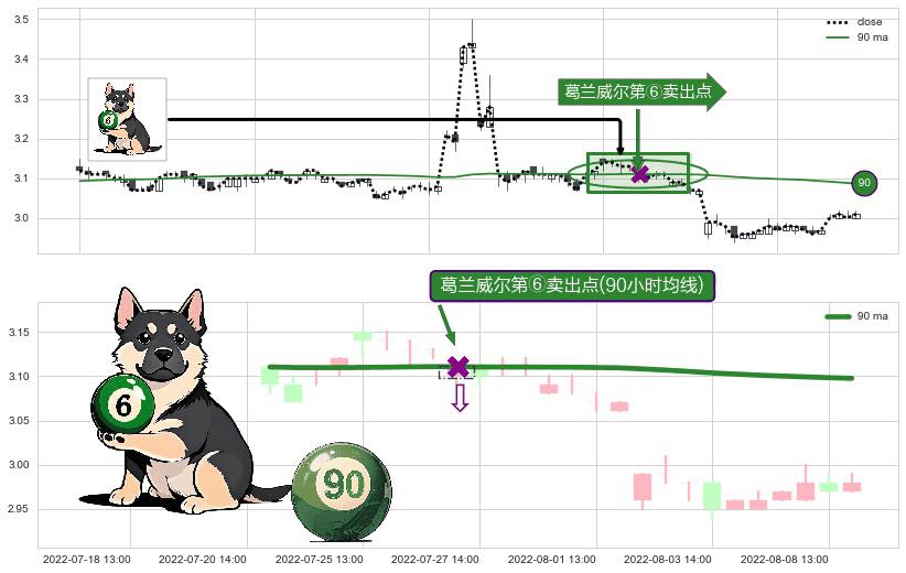形态多维评估: ⚀ 2022-07-27 13:00:00-小时显现 葛兰威尔均线 90小时均线 第⑥卖出点 走势反转见顶信号,后市看跌,卖出信号