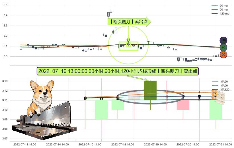 形态多维评估: ⚀ 2022-07-19 13:00:00小时显现 60小时-90小时-120小时均线 【断头铡刀】卖出点 看空信号,后市看跌,卖出