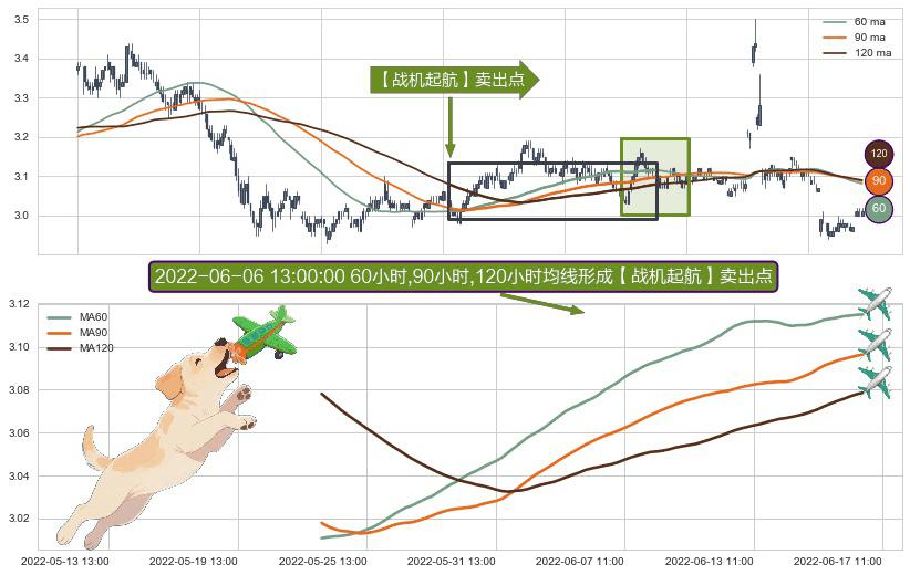 形态多维评估: ⚀ 2022-05-24 10:00:00小时-2022-06-16 14:00:00小时显现 60小时-90小时-120小时均线 【战机起航】卖出点 看空信号,后市看跌,卖出