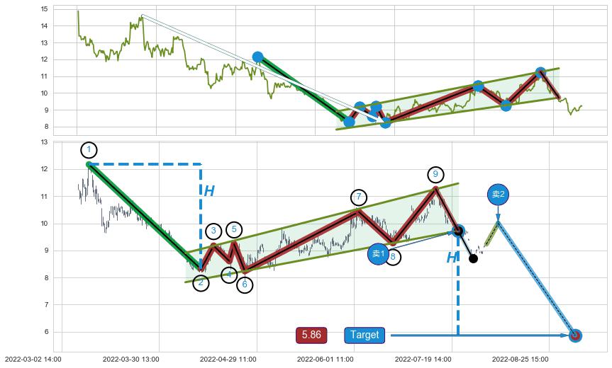 ➣ D点拟合预测价格12.36,距离最后交易收盘价格9.23相差 +33.94%