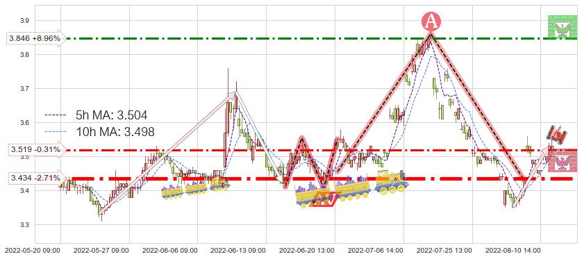 ♘ 阻力价格位3.846,可信任强度57.15%,距离最后交易2022-08-12 14:00形成的收盘价格3.530相差 +8.96%