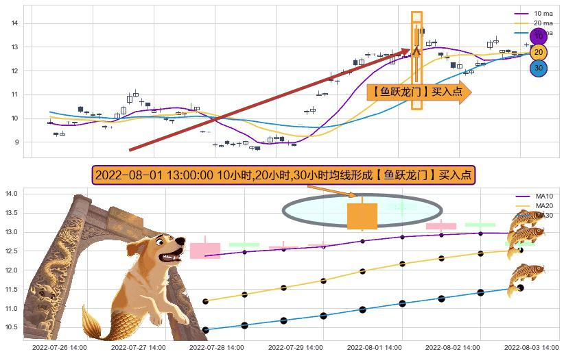 ⚀ 2022-08-01 13:00:00小时显现 10小时-20小时-30小时均线 【鱼跃龙门】买入点 看多信号,后市看涨,买入