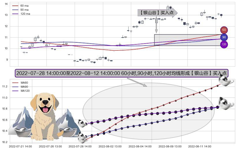 ⚀ 2022-07-29 13:00:00-小时至2022-08-12 14:00:00-小时显现 60小时-90小时-120小时均线 【银山谷】买入点 看多信号,后市看涨,买入