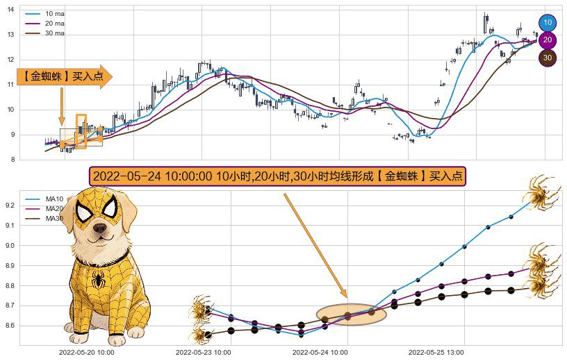 ⚀ 2022-05-24 10:00:00小时显现 10小时-20小时-30小时均线 【金蜘蛛】买入点 看多信号,后市看涨,买入
