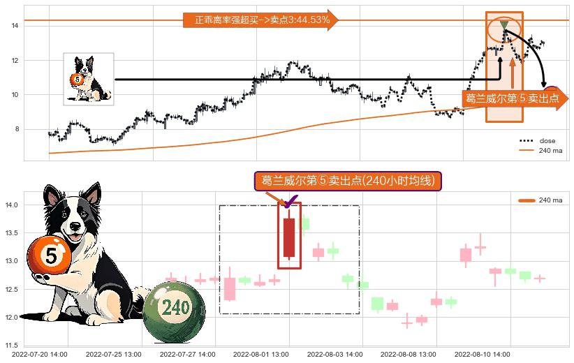 ⚀ 2022-08-01 13:00:00-小时显现 葛兰威尔均线 240小时均线 第⑤卖出点 上升趋势均值回复的短线回落信号,后市看跌,卖出信号