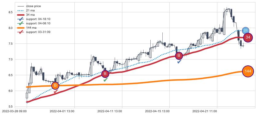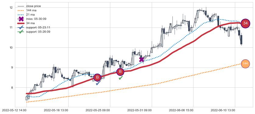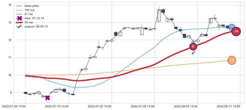 ⚂ 2022-07-07 13:00:00-小时均线向下破位,2022-07-18 13:00:00-小时重新上穿突破均线,均线支撑再次生效