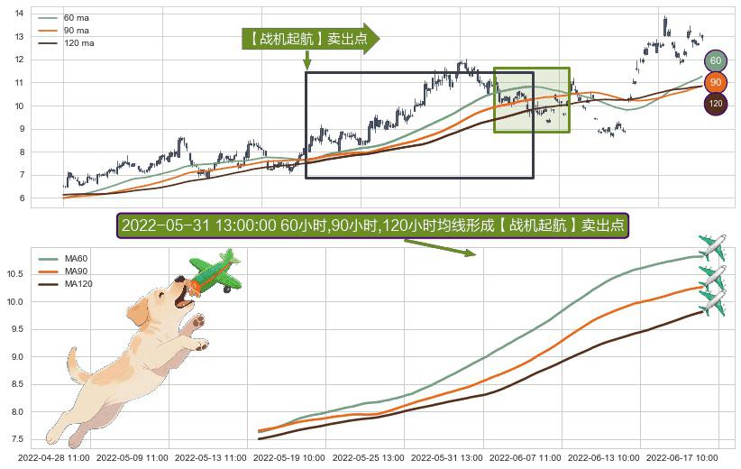 ⚀ 2022-05-13 15:00:00小时-2022-06-16 11:00:00小时显现 60小时-90小时-120小时均线 【战机起航】卖出点 看空信号,后市看跌,卖出