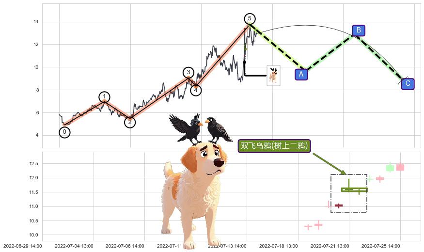 | 5 🅚:双飞乌鸦(树上二鸦) ➕ ☯️:缠论买卖点上升缠中枢AB形成后猜想拐点1卖已到达,猜想后续持续下跌(均值回复) ☞ 看空信号 ⇥ 【🅚线】交织【图形】⇥ 综合量化分数: 49 | > |