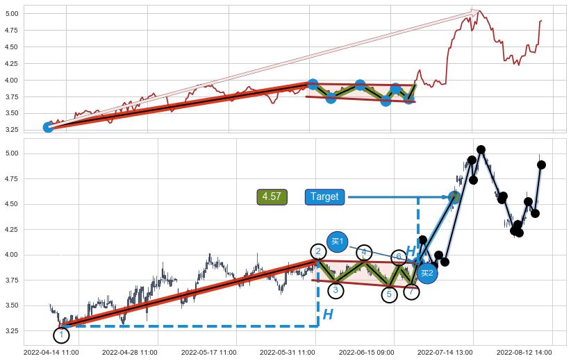 ➣ 【买2】: 保守型 买点 →(06-23:13: 3.930 )形成降⚑旗形突破后的【回抽确认】