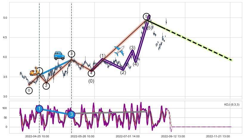 | 3 🅚:下跌两颗星 | 下跌三颗星 ➕ 🌊:波浪理论猜想上涨浪5已形成,猜想后续形成回调abc下跌(均值回复) ☞ 看空信号 ⇥ 【🅚线】交织【图形】⇥ 综合量化分数: 49 | > |