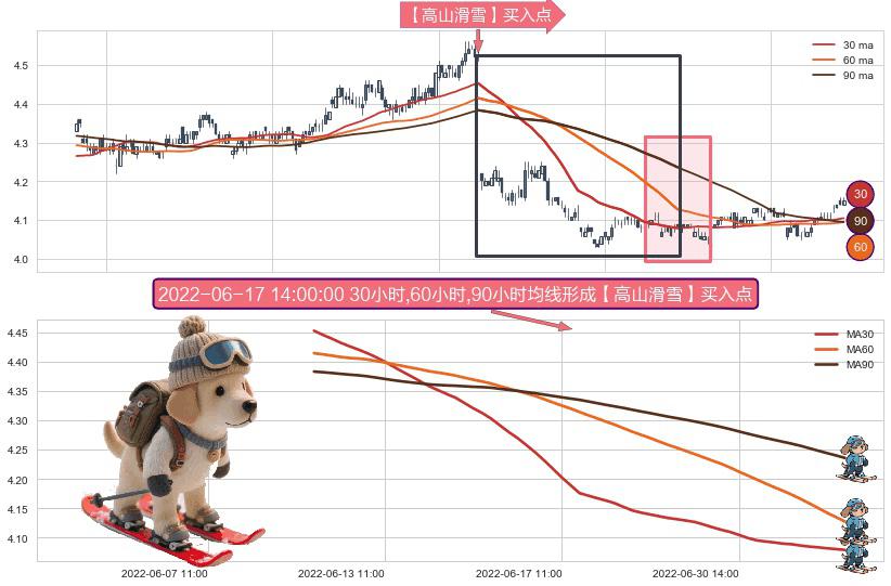 ⚀ 2022-06-09 14:00:00小时-2022-07-08 14:00:00小时显现 30小时-60小时-90小时均线 【高山滑雪】买入点 看多信号,后市看涨,买入