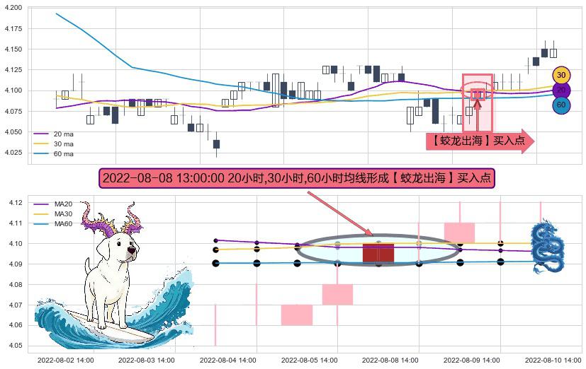 ⚀ 2022-08-08 13:00:00小时显现 20小时-30小时-60小时均线 【蛟龙出海】买入点 看多信号,后市看涨,买入