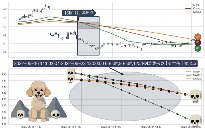 ⚀ 2022-06-16 13:00:00-小时至2022-06-23 13:00:00-小时显现 60小时-90小时-120小时均线 【死亡谷】卖出点 看空信号,后市看跌,卖出