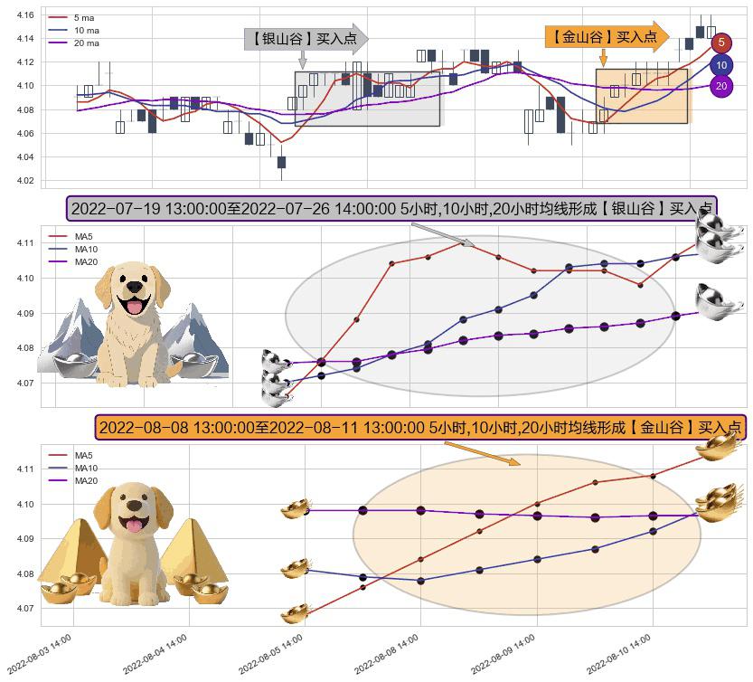 ⚃ 2022-08-08 14:00:00-小时至2022-08-11 13:00:00-小时显现 5小时-10小时-20小时均线 【金山谷】买入点 其再次确认了买入信号,可靠性更强,买入