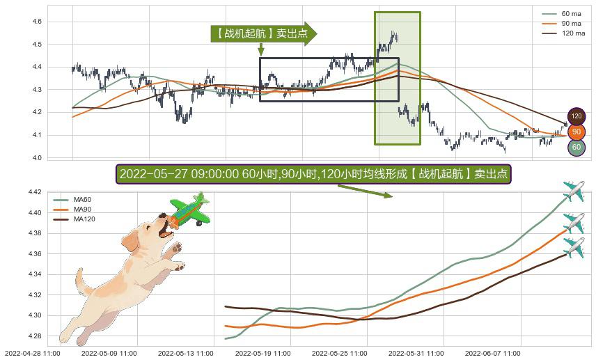 ⚀ 2022-05-16 09:00:00小时-2022-06-09 14:00:00小时显现 60小时-90小时-120小时均线 【战机起航】卖出点 看空信号,后市看跌,卖出
