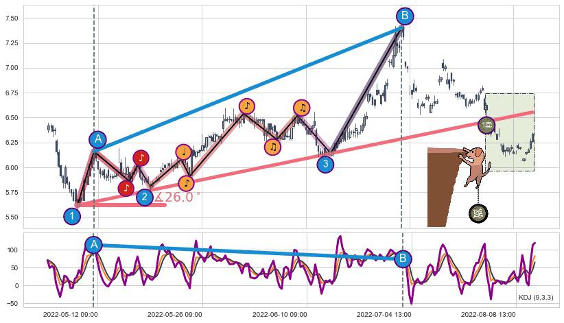 从2022-06-01 09:00至2022-06-08 14:00,共包含25个小时,阶段股价下跌-0.36%,阶段股价变动位移路程比: 1 : 47