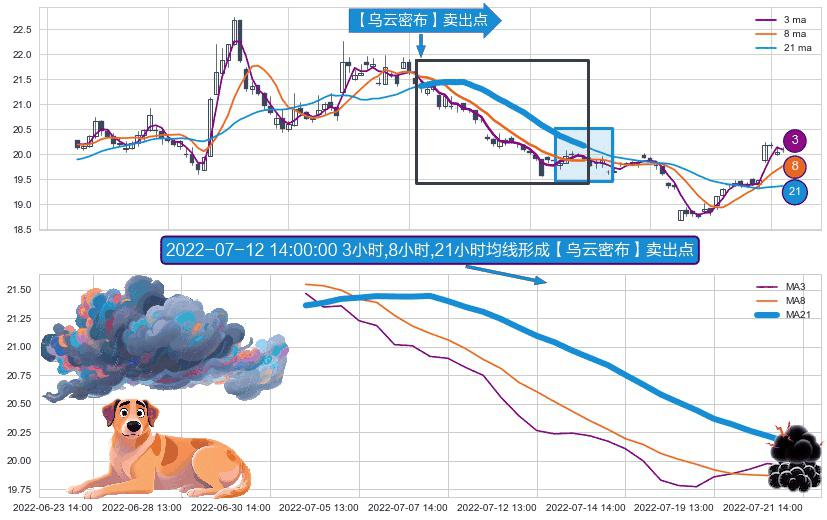⚀ 2022-07-01 14:00:00小时-2022-07-21 13:00:00小时显现 3小时-8小时-21小时均线 【乌云密布】卖出点 看空信号,后市看跌,卖出