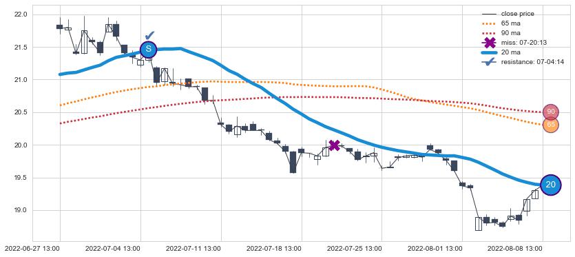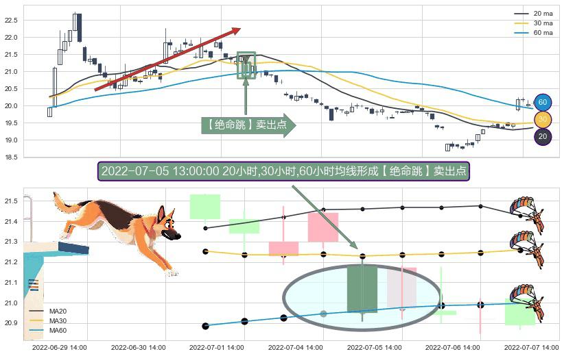⚀ 2022-07-05 13:00:00小时显现 20小时-30小时-60小时均线 【绝命跳】卖出点 看空信号,后市看跌,卖出