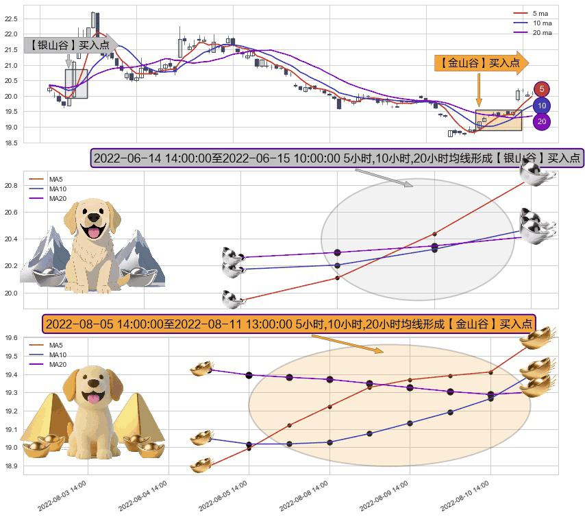 ⚃ 2022-08-08 13:00:00-小时至2022-08-11 13:00:00-小时显现 5小时-10小时-20小时均线 【金山谷】买入点 其再次确认了买入信号,可靠性更强,买入