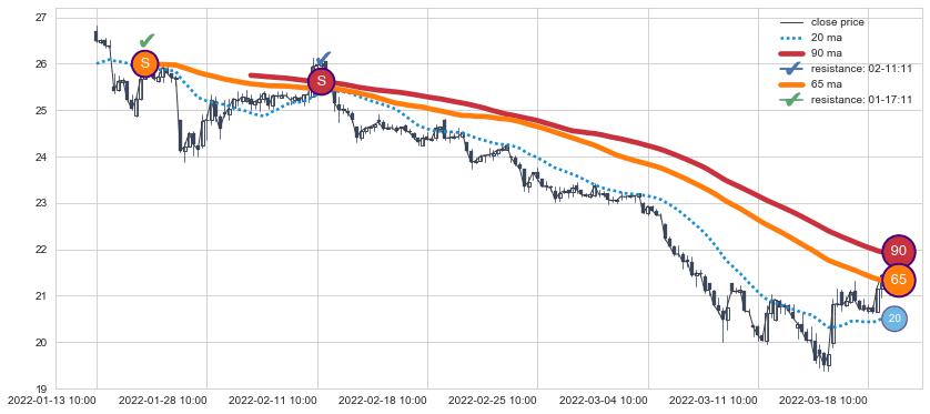 ➢ 最优均线组合共正确确认支撑阻力信号4处,正确确认率 80.00%