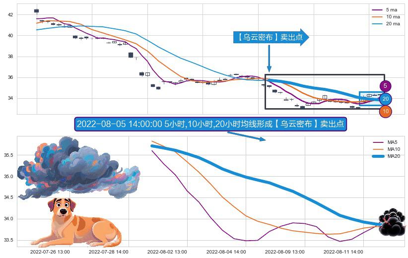 ⚀ 2022-07-29 14:00:00小时-2022-08-12 14:00:00小时显现 5小时-10小时-20小时均线 【乌云密布】卖出点 看空信号,后市看跌,卖出
