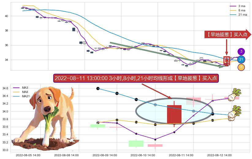 ⚀ 2022-08-11 13:00:00小时显现 3小时-8小时-21小时均线 【旱地拔葱】买入点 看多信号,后市看涨,买入