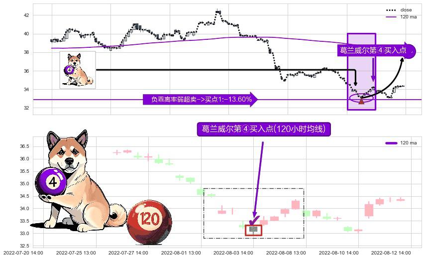 ⚀ 2022-08-03 14:00:00-小时显现 葛兰威尔均线 120小时均线 第④买入点 下降趋势均值回复的短线反弹信号,后市看涨,买进信号