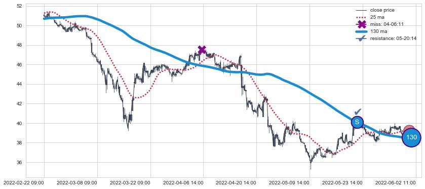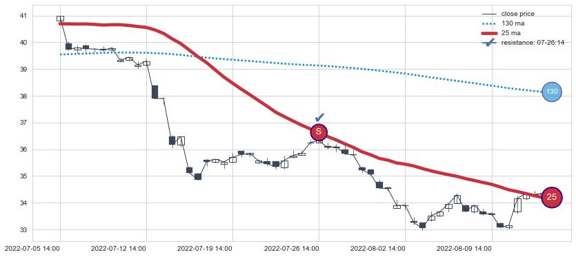 ⚂ 2022-06-15 13:00:00-小时均线向上突破,2022-07-12 13:00:00-小时重新下穿均线破位,均线阻力再次生效