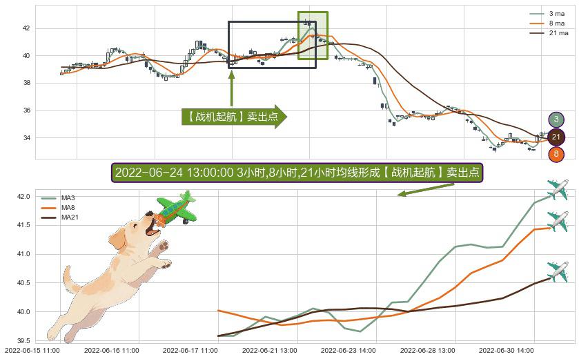 ⚀ 2022-06-17 11:00:00小时-2022-07-01 13:00:00小时显现 3小时-8小时-21小时均线 【战机起航】卖出点 看空信号,后市看跌,卖出