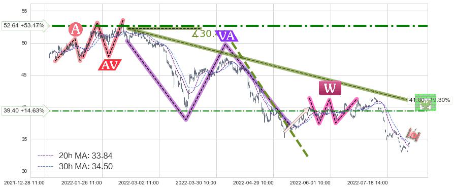 ♘ 在最后的下跌阶段2022-02-15 13:00至2022-08-12 14:00,存在 持续未破位的阻力位 ,阻力价格41.00,可信任强度82.18%,其距离最后价格34.37相差 +19.30%