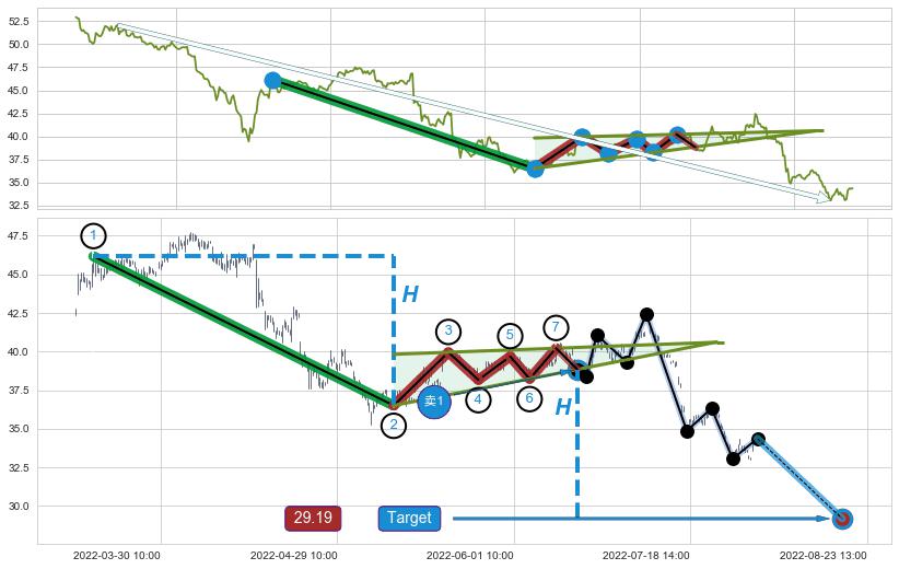 ➢ 最小中继整理跌幅→𝐇: 9.66 (𝐇楔型旗杆的长度:楔型起点→顶点)