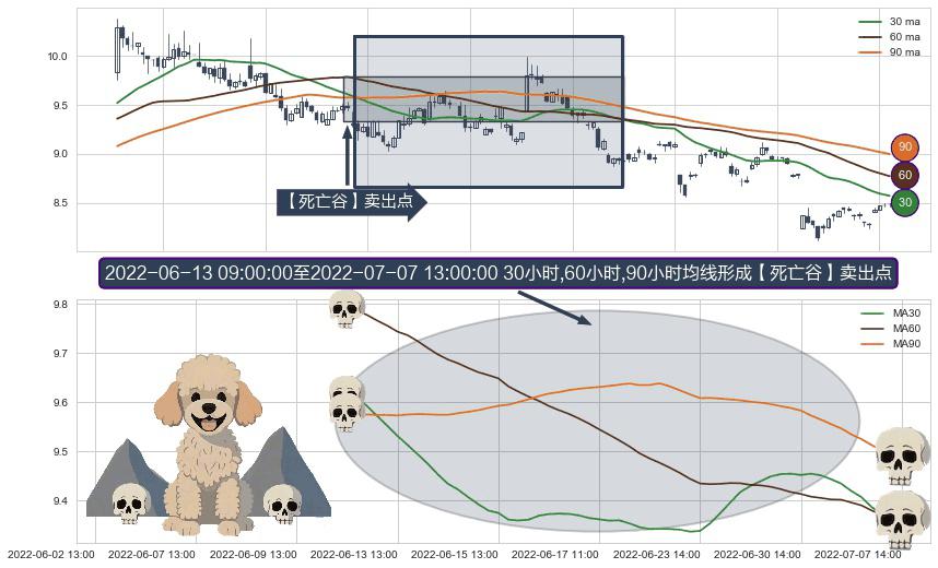 ⚀ 2022-06-13 10:00:00-小时至2022-07-07 13:00:00-小时显现 30小时-60小时-90小时均线 【死亡谷】卖出点 看空信号,后市看跌,卖出