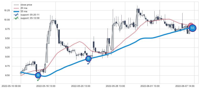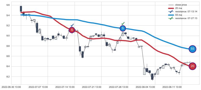 ⚂ 2022-06-21 14:00:00-小时均线向上突破,2022-07-04 13:00:00-小时重新下穿均线破位,均线阻力再次生效