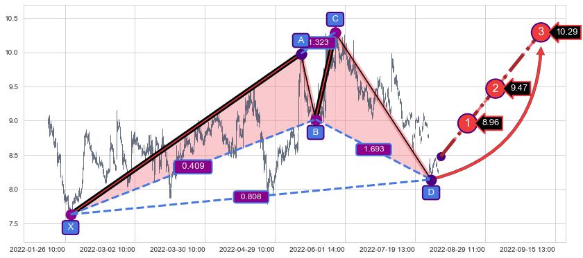 ➣ 未完成【蝙蝠】形态起点X: 01-27:14, 已到达C点: 06-24:13, 预测最终D点: 09-07:11, 共621交易小时