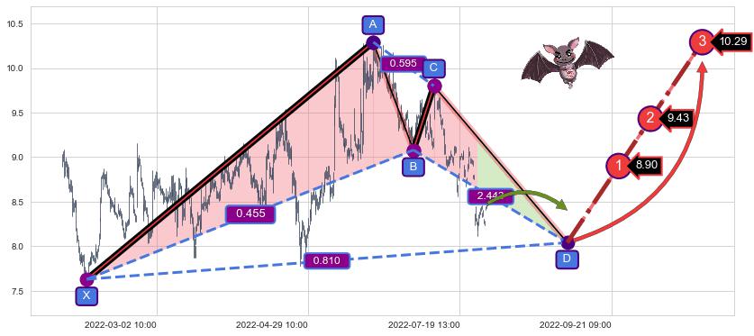 ➢ 接近预测D点位置, 随时警戒看涨【蝙蝠】形态反转启动