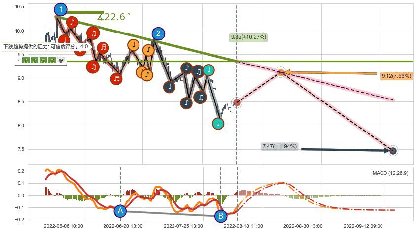 ♘ 在最后的下跌阶段2022-05-30 09:00至2022-08-12 13:00,存在 持续未破位的阻力位 ,阻力价格9.35,可信任强度84.01%,其距离最后价格8.48相差 +10.27%