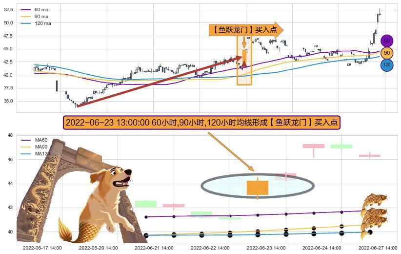 ⚀ 2022-06-23 13:00:00小时显现 60小时-90小时-120小时均线 【鱼跃龙门】买入点 看多信号,后市看涨,买入