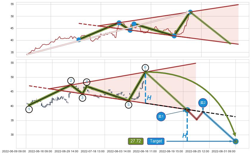 ➢ 最小反转跌幅→𝐇: 10.82 (逐步抬高阻力斜边最后的阻力点⑥与支撑边垂直距离)