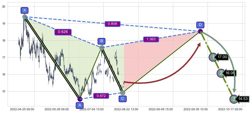 ➣ D点拟合预测价格18.53,距离最后交易收盘价格15.55相差 +19.17%
