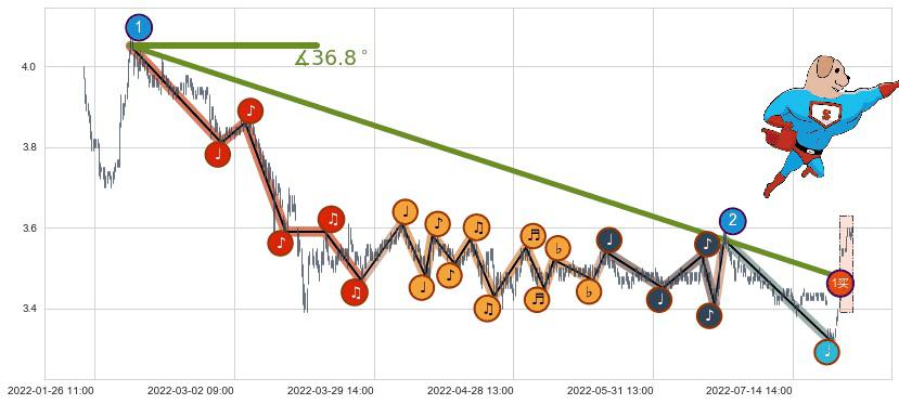 ⚔️ 2022-02-09 13:00-2022-08-10 14:00下跌趋势存在反转上涨[机会],其原下跌趋势的阻力位(3.467)已被突破[强支撑信号],原下跌趋势角度: 36.8˚