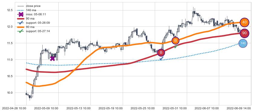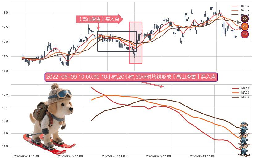 ⚀ 2022-06-02 14:00:00小时-2022-06-14 13:00:00小时显现 10小时-20小时-30小时均线 【高山滑雪】买入点 看多信号,后市看涨,买入