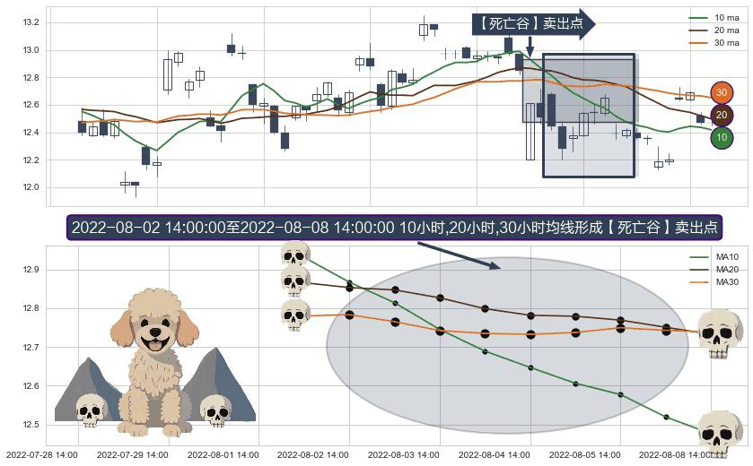 ⚀ 2022-08-03 13:00:00-小时至2022-08-08 14:00:00-小时显现 10小时-20小时-30小时均线 【死亡谷】卖出点 看空信号,后市看跌,卖出