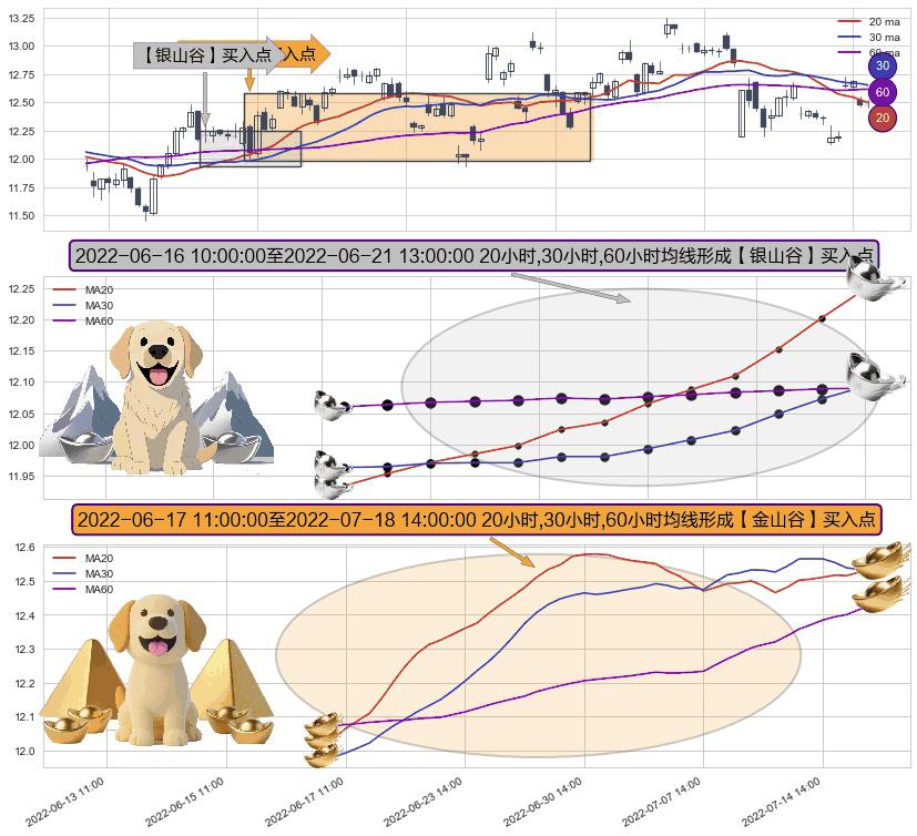 ⚃ 2022-06-17 13:00:00-小时至2022-07-18 14:00:00-小时显现 20小时-30小时-60小时均线 【金山谷】买入点 其再次确认了买入信号,可靠性更强,买入