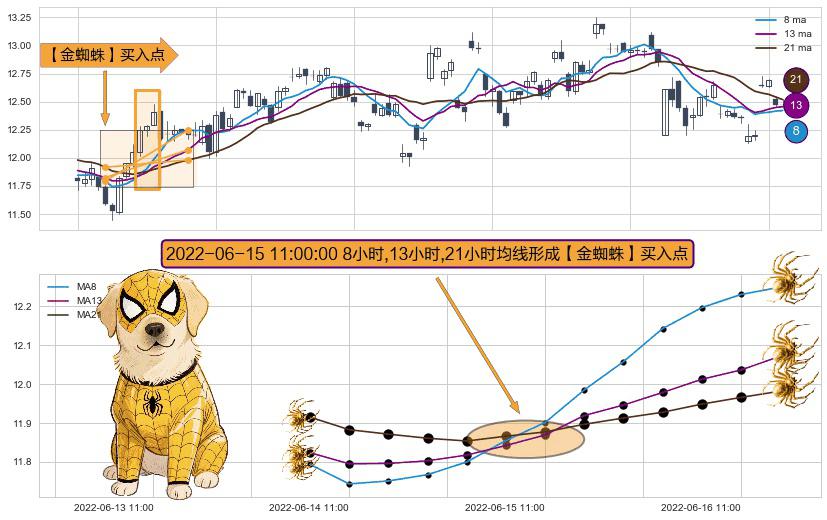 ⚀ 2022-06-15 11:00:00小时显现 8小时-13小时-21小时均线 【金蜘蛛】买入点 看多信号,后市看涨,买入