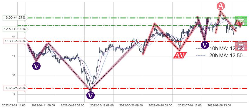 ♘ 阻力价格位13.00,可信任强度63.12%,距离最后交易2022-08-12 14:00形成的收盘价格12.47相差 +4.27%